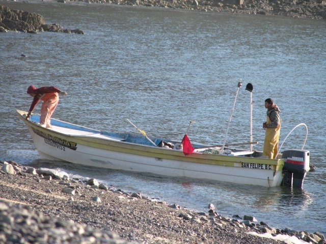 Two fishermen landing a ponga at Campo Uno in San Felipe, Mexico.