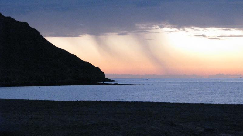 A rain shower passes over the lagoon at Campo Uno in San Felipe, Mexico